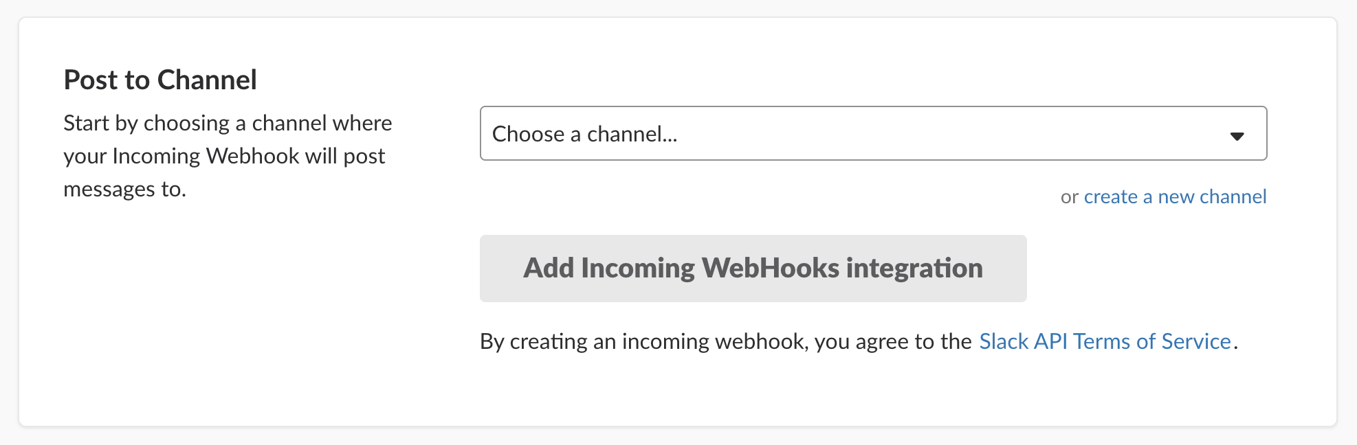 First, you’ll need to set up a new incoming webhook in your team’s Slack configuration. An incoming webhook is a method for Slack to receive incoming messages to be posted to your Slack team from external services.